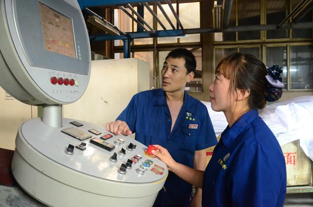 圖為面一車間拉幅預(yù)縮精益生產(chǎn)承包小組副組長(zhǎng)孫新強(qiáng)(左)、預(yù)縮機(jī)機(jī)長(zhǎng)郭芳,在預(yù)縮機(jī)操作臺(tái)前準(zhǔn)備開車生產(chǎn)的情形。
