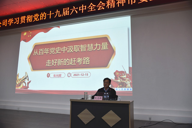 12月18日,市委宣講團成員、市政協臺港澳僑和外事委員會副主任朱光輝來到公司,對黨的十九屆六中全會精神進行專題宣講。宣講會由公司團委書記陳冰主持,公司黨委成員、行政班子成員、黨支部書記、黨員代表、預備黨員以及來自公司各個序列的中高層管理者,共120余人在聆聽了當天的宣講。