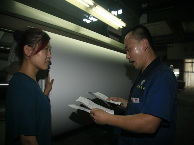 花一車間后處理技術(shù)員張延軍(圖右)與軋光機(jī)機(jī)長(zhǎng)吳秀祝在交流生產(chǎn)情況。他倆表示,每一米優(yōu)質(zhì)產(chǎn)品都是靠專注認(rèn)真干出來(lái)的。