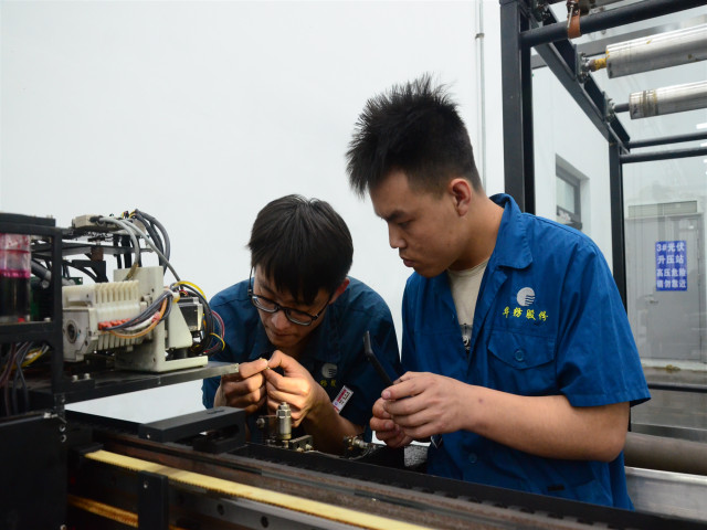 圖為家紡車間呂鵬廷(左)與尹廣濤在修復光柵讀頭。